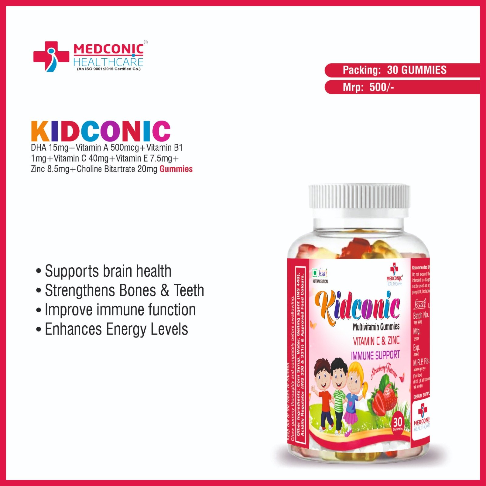 The healthcare industry is growing rapidly, and multivitamin gummies have become a popular choice for people of all ages. These gummies provide essential nutrients in a convenient and tasty form. Medconic Healthcare offers a PCD Pharma Franchise opportunity for KIDCONIC MULTIVITAMIN GUMMIES – DHA, VIT.A, VIT.B1, VIT.C, VIT.E, ZINC, and CHOLINEBITARTRATE GUMMIES. This is a great business opportunity for wholesalers, doctors, and medical representatives (MRs) looking to expand their product portfolio.